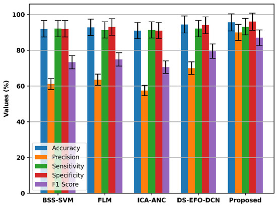 This section emphasizes the effectiveness of the proposed model by comparing it with the outcomes of existing methodologies and illustrating its outcomes based on several metrics. The comparisons are made from the previous techniques with varying accuracy, precision, sensitivity, specificity, F1 score, FPR, FNR, NPV, FDR, and MCC. Comparisons are made with the existing techniques such as Blind Source Separation-Support Vector Machines (BSS-SVM), Firefly–Levenberg–Marquardt (FLM), Independent Component Analysis and Adaptive Noise Cancellation (ICA-ANC), and Distance Sorted-Electric Fish Optimization and Deformable Convolutional Networks (DS-EFO-DCN) [29]. All reported performance metrics for the existing models were benchmarked against the same dataset and evaluation criteria used for the proposed model. This ensures a fair comparison and validity of the results. The metrics were obtained from previously published studies, and where applicable, we have reproduced the results using the original authors’ methodologies to confirm their accuracy. This rigorous benchmarking process allows us to demonstrate the improvements offered by this proposed model to established techniques.