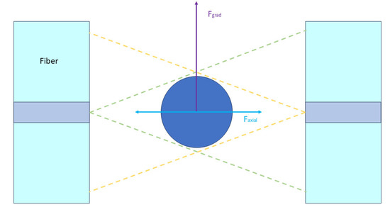 Optical stretching utilizes two back-propagating unfocused laser beams to exert an action on a dielectric object. These two laser beams create two orthogonal induced forces, the gradient force and the axial force, with the gradient force pulling the cell toward the fiber centerline [44]. The axial force pushes the cell away from the ends of the fiber, stretching the cell in the direction of the beam axis (Figure 6). Guck et al. [18] utilized this principle to develop the first optical stretching device in 2000, which can be used to measure the dielectric viscoelasticity of materials, including cells. Through a combination of optical stretching and microfluidics, i.e., the use of optical fibers to capture and stretch flowing cells, they measured the optical deformability of the mouse fibroblast cell line BALB/3T3 and its cancerous counterpart and human mammary epithelial cells and their cancerous counterparts and found that the optical deformability of highly metastatic breast cancer cells, MDA-MB-231, was significantly reduced by all-trans retinoic acid treatment, which was attributed to the fact that all-trans retinoic acid reduced the metastatic properties of this cell [5]. Huang et al. [19] developed a microfluidic chip combining optical fibers and electrodes to measure the mechanical and dielectric properties of normal cells (e.g., HepaRG, MCF10A) and cancer cells (e.g., HeLa, A549, and MCF7), achieving an integrated measurement of multi-physical field parameters and further validating the potential of this method for cancer cell analysis.