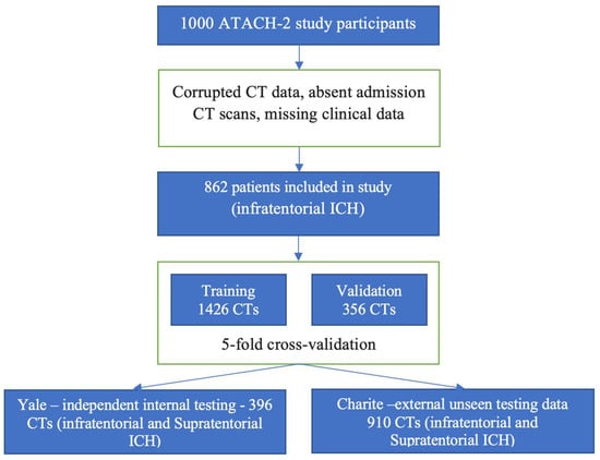 - Sharrock, M.F.; Mould, W.A.; Ali, H.; Hildreth, M.; Awad, I.A.; Hanley, D.F.; Muschelli, J. 3D Deep Neural Network Segmentation of Intracerebral Hemorrhage: Development and Validation for Clinical Trials. Neuroinformatics 2021, 19, 403–415. [Google Scholar] [CrossRef] [PubMed]