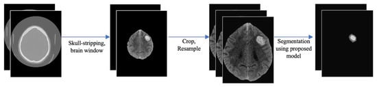 - Cropping and resampling: The 3D images were automatically cropped using a bounding box around the foreground object (brain tissue), reducing the image size while preserving objects. Then, we resampled all images and segmentation masks to the mean spacing of training set. This will mitigate the heterogeneity in slice thickness and voxel dimensions across different head CTs and provide consistent voxel spacing for the model.