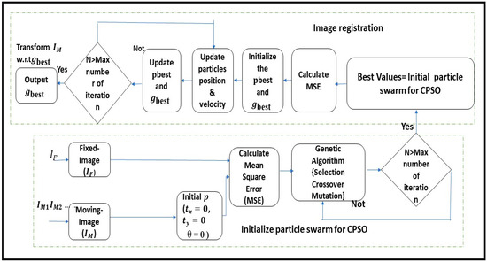 The translation parameters and the rotation angle were initially set to zero (, , θ = 0). However, these parameters were continuously updated throughout the process to achieve the best alignment between the two images during the execution of the hybrid GA-CPSO algorithm.