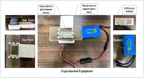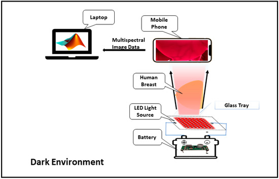 The experimental setup comprised three primary components: an illumination system, an image acquisition module, and an image processing unit. The optical illumination for breast tissues consisted of four different LED systems, each emitting light at specific wavelengths (i.e., 600 nm, 620 nm, 670 nm, and 760 nm). This selection of optical wavelengths was informed by the light absorption properties of tumor tissues and the sensitivity range of the mobile phone camera, ensuring optimal detection capabilities. Moreover, for each wavelength, the LED system comprised 64 LEDs arranged in an 8 × 8 square matrix (all the LEDs in this array were designed to emit light at the same wavelength). This system was powered by portable lithium batteries, the highest current is 2.8 A; for the 600 nm and 620 nm LEDs the voltage supplied is 21 V, while for the 670 nm and 760 nm LEDs it is 14.8 V. An iPhone 12 Pro-Max rear camera was used to record videos of the human breast. The image processing was performed with an Acer desktop PC (Model Shangqi X4270) equipped with MATLAB version 2022a and Python 3.9.
