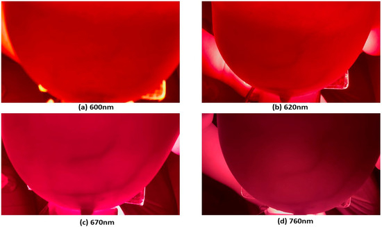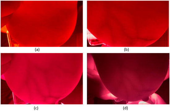 The handheld phone camera’s distance was adjusted and oriented to ensure complete breast tissue coverage and precise focus. It was ensured that the light was transmitted effectively without excessive camera glare. The data were acquired with the mobile phone camera by recording a 10 s video for each wavelength. This process was repeated for both subjects across all four wavelengths, resulting in a comprehensive dataset. The video frame rate was set to 60 frames per second (fps) for 600, 620, and 670 nm, and 30 fps for the 760 nm wavelength. This variation in frame rates was due to the camera’s automatic adjustment, with the brighter wavelengths (600 nm, 620 nm, and 670 nm) set to 60 fps and the darker 760 nm wavelength adjusted to 30 fps to optimize image quality. The first frame for each wavelength image is shown in Figure 4 and Figure 5 for both subjects, respectively.