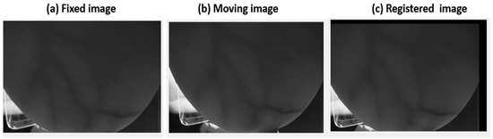 Following the GA’s optimization, the best values obtained (the value of , , and ) were utilized to initialize particles in the CPSO phase. The constriction factor in CPSO was a critical parameter influencing particle movement in the optimization process. It was used to balance the exploration and exploitation phases. The constriction factor limited the particle’s velocity, preventing excessive movement and guiding the swarm toward optimal solutions. The proposed SCF in CPSO enhanced convergence speed and solution quality, offering improved optimization performance and stability in hybrid algorithms (Table 1). Specifically, tracking the best positions for each particle and the global best position ensured robust convergence. The “global best position” refers to the set of translation and rotation parameters (, , and ) that result in the highest degree of alignment between the fixed and moving images, as determined by the lowest mean squared error (MSE). The final results were displayed, and the optimal translation and rotation was applied to register the moving image precisely with the fixed image, as depicted in Figure 6. The black edges in the registered image (c) indicate the shifts along the x and y axes, as well as the rotation, reflecting the changes in image alignment.