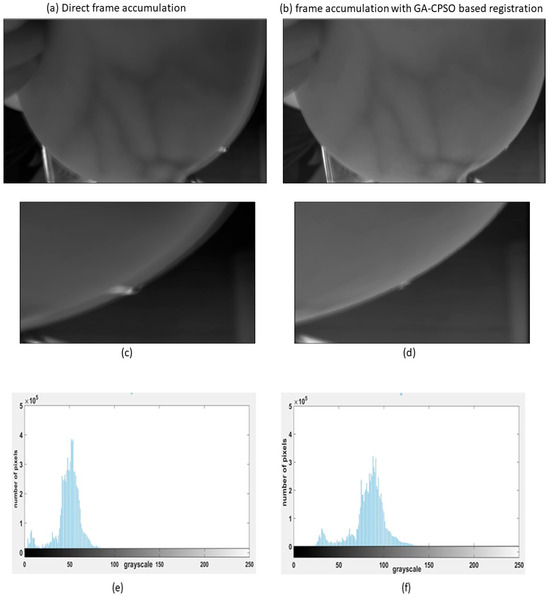 An objective comparison of the GA-CPSO and RPIRA methods, based on these metrics, is presented in Table 6. In particular, the EOG values were higher for the GA-CPSO technique than the RPIRA method (10.09 vs. 8.58), indicating sharper edges in images processed with GA-CPSO. Moreover, the GA-CPSO algorithm demonstrated a substantially higher BGF, and consequently better image focus, compared to the RPIRA method (11.35 vs. 1.69). Similarly, the significantly higher MMD metric for the GA-CPSO algorithm revealed superior contrast preservation. It is worth noting that the RPIRA method relies on gradient descent as the registration algorithm, which appears to be less effective than the GA-CPSO approach in preserving image quality metrics. Collectively, these results demonstrate that the GA-CPSO algorithm outperforms the RPIRA method in all evaluated metrics, underscoring its enhanced effectiveness in frame accumulation.