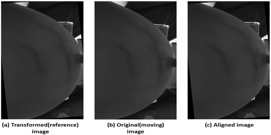 where and are representations of the fixed image and moving image, respectively, the variable ‘’ signifies the total pixel count in the image. ‘T’ denotes the transformation applied to the moving image using two-dimensional parameters (, , θ) before proceeding with the MSE calculation. The transformation parameters include translation in the and directions, as well as the rotation angle θ.