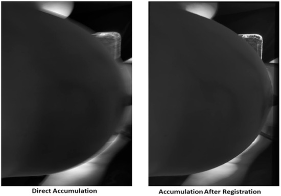 Figure 10 visually confirms the quantitative improvements seen in Table 5. The direct accumulation image shows more blurring and less clarity, while the image after registration displays enhanced sharpness and detail, especially in regions affected by motion or misalignment. This visual comparison aligns with the metrics shown in Table 5, validating that the registration step before accumulation plays a crucial role in improving image quality.