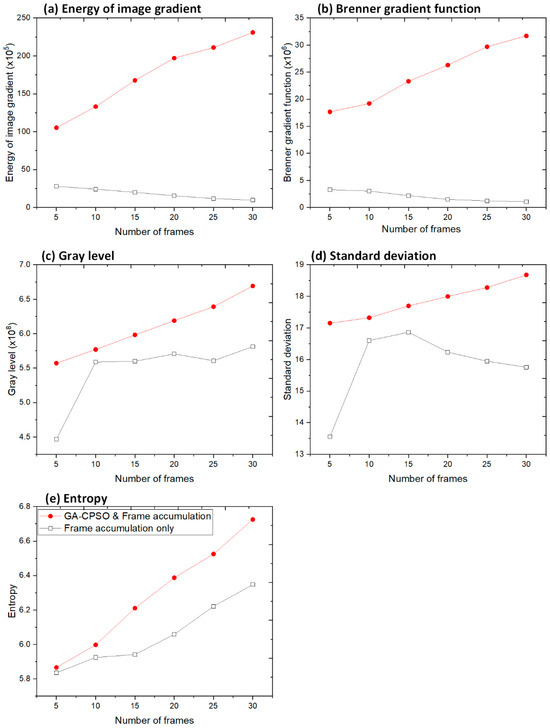 Moving to Figure 11 (a result of Subject 2), the quality enhancement brought by registration is further reinforced through a comparison of multiple frames. Here, the plotted metrics demonstrate the quantitative differences between frame accumulation alone and frame accumulation with GA-CPSO-based registration. As more frames are accumulated, the differences between the two methods become increasingly pronounced, with registration consistently improving sharpness, contrast, and detail retention. The increasing gap in metrics such as Brenner gradient and energy of image gradient further highlights the critical role of registration in reducing motion artifacts and enhancing the overall quality of multispectral breast images.