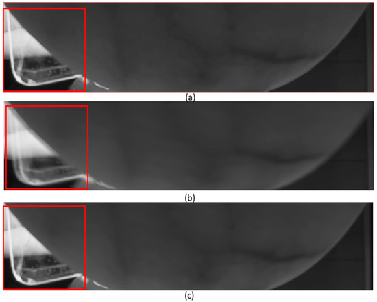 Cropped image showing ghosting effect due to frame accumulation from 670 nm wavelength images: (a) original single frame, (b) 20 frames direct accumulation, and (c) 20 frames accumulation after GA-CPSO registration.