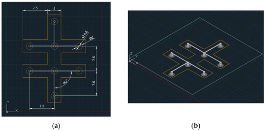 Design solutions chosen for the creation of the sensor with AJP technology: (a) eight-pole sensor in plane view; (b) eight-pole sensor in 3D view.