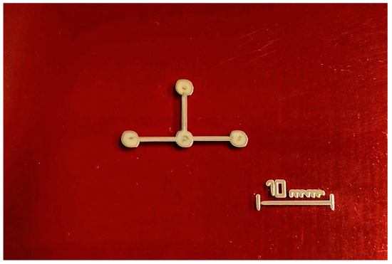 From these values, the test sensors needed for the comparison test were produced. Pictures of the sensors prepared for testing are shown in Figure 2. All connections were made with solder paste Silver Conductive Epoxy Adhesive 8331D™ from MG Chemicals Ltd. (Burlington, ON, Canada). Figure 2 shows only one semi-part of the complete sensor, as depicted in Figure 1a,b. Due to the symmetry of the sensor, a semi-part is sufficient for electrical characterization.