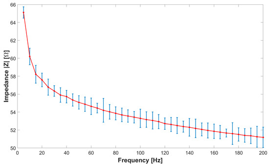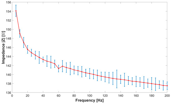 Frequency–impedance trend for the CALLIBRI® sensor with conductive gel. The average and standard deviation for each set of measurements are shown.