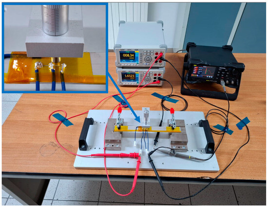 Figure 4 shows a decreasing trend of the impedance value as the excitation frequency of the sensor increases. In this case, the AJP sensor is in a structurally undeformed condition. It is evident that the general trend is very similar to that shown in Figure 3 for the CALLIBRI® sensor. Figure 5 shows an experimental set-up built specifically to test the possible interactions between the controlled structural deformation of the sensor deposed in AJP and the impedance properties. The sensor structure realized by Silver nanoparticle deposition is closely related to the Kapton substrate containing it. The electro-conductive trace, unlike an ordinary metal filament, cannot have its own volume without a support and, for this reason, cannot be tested separately from the support. In order to verify the changes of impedance under deformation, a specific support was made with the aptitude to deform a sensor placed on Kapton attached to an aluminum sheet. This sheet has dimensions of 250 × 25 × 1.5 mm and is constrained by means of two clamps (the clamps are shown in red) at the ends. In the center, the plate is stressed by a graduated micrometer screw to assess the imposed deformation. Given the natural curvature of the muscles where these sensors will be used, it was decided to impose a static deflection of 1 mm on the slab to obtain a curvature similar to real operating conditions. The setup is equipped with a voltmeter and ammeter mentioned above and the signal generator RIGOL® DG2102 100 MHz 250 MSa/s. Looking at Figure 5, it can be seen that the signal generator acts on only one branch of the three constituting the sensor. In particular, the branch of interest is indicated by the red arrow on the enlargement. In order to assess the impedance with structural deformation along the X- and Y-directions (shown in Figure 1), two sensors were placed, one horizontally and one vertically.