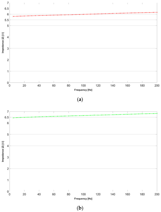 Figure 7 shows the impedance–frequency trend measured in one branch of the sensor, as described above, for a respectively unloaded or stressed slab but with the sensor oriented orthogonally to the long side of the slab and laid along the Y-axis. Figure 7a shows the impedance variation in relation to the excitation frequency for the mechanically unstressed sensor. A modest increase in the impedance value is observed as the frequency increases and is slightly fluctuating. Figure 7b shows the impedance variation in relation to the excitation frequency for the mechanically stressed sensor. It is possible to observe that the impedance increases as the excitation frequency increases. This is attributable to the fact that the lateral compression of the sensor modifies the impedance. However, it remains observable that, in both deformed and undeformed conditions, the sensor has an impedance response that is almost stable across frequencies.