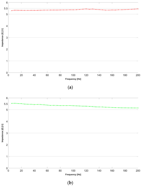 Figure 6 shows the impedance–frequency trend measured in one branch of the sensor for the unloaded and loaded conditions, with the sensor oriented parallel to the long side of the slab and laid down according to the X-axis. Figure 6a shows the impedance variation in relation to the excitation frequency for the mechanically unstressed sensor. A modest increase in the impedance value can be observed as the frequency increases. This result can be found in any electrically conductive component as frequency increases. Figure 6b shows the impedance variation in relation to the excitation frequency for the mechanically stressed sensor. The trend is largely similar to the unstressed condition, but the average impedance is relatively higher. This implies that a major deformation of the sensor does not change the law of impedance variation but only generates a linear scaling effect.