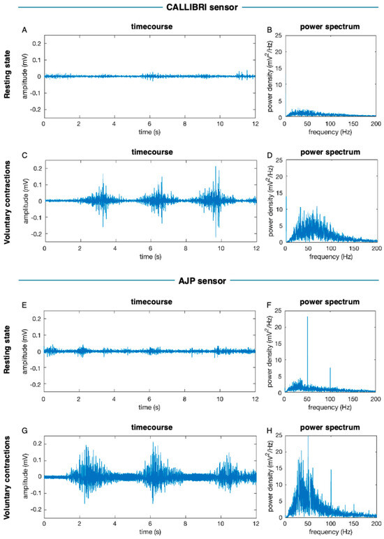 EMG signal throught the Callibri and AJP printed sensor; (A) Callibri resting state timecourse; (B) Callibri resting state power spectrum; (C) Callibri MVC timecourse; (D) Callibri MVC power spectrum; (E) AJP sensor resting state; (F) AJP sensor power spectrum; (G) AJP sensor MVC resting state; (H) AJP sensor power spectrum.