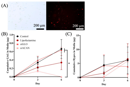 (A) Phase contrast (left) and fluorescence (right) images of siGLO monolayer cell culture at day 3. (Scale bars = 200 µm) (B) GAG production of FCCs transfected with ACAN siRNA (light pink triangles), siGLO (dark pink triangles), Lipofectamine (red circles), or untransfected controls (black circles) in media over 6 days in 2D culture (C) Hydroxyproline production of FCCs transfected with ACAN siRNA, siGLO, Lipofectamine, or untransfected controls in media over 6 days in 2D culture. Analyzed using 1-way ANOVA with Tukey’s multiple comparisons test (* = p < 0.05).