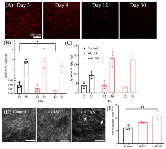 Successful inhibition of aggrecan production by siRNA remained effective for about 12 days in culture, as indicated by loss of siGLO signal in 2D culture (Figure 2A) and as assessed by GAG accumulation at 12 and 30 days in TE disc constructs (Figure 2B–E). While large aggregating proteoglycans such as aggrecan are important to the compressive function of the developed meniscus, the temporal nature of their deposition during tissue maturation is key in allowing for the complex organization of the collagen matrix to occur. In the native meniscus, aggrecan content is minimal in early development while the collagen network is established [13,14,15]. As the tissue matures, proteoglycans are deposited in distinct niches, notably after a collagen network architecture has been formed. Additionally, it has been shown in fibrocartilage, both in vivo and in vitro, that excess proteoglycan deposition during development can inhibit the formation of an organized collagen fiber network [13,16,19]. Notably, in the TE disc constructs in this study, even a suppression of aggrecan production up to 12 days facilitated increased fiber diameter in transfected constructs grown out to 30 days in culture.