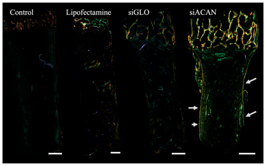 The organization of collagen fiber networks at the whole tissue level was visualized using polarized light microscopy of picrosirius red-stained linear meniscal enthesis constructs. Untransfected control, Lipofectamine, and siGLO constructs displayed little birefringent signal, indicating weak fiber formation, especially seen in control and siGLO constructs (Figure 3). The siACAN group showed a slight increase in birefringence, as indicated by increased yellow and green signals, and seen most prominently on the edges of the construct (Figure 3, white arrows). Although there does not appear to be consistent or well-established fiber orientation, the siACAN group appears have fibers parallel to the interface that turn perpendicular in the bulk tissue.