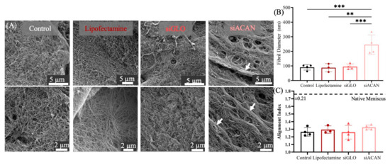 To assess the collagen organization at a more local level, we looked at the fibril alignment and fibril diameter of collagen in these tissues using SEM. siACAN-transfected constructs displayed an increased collagen fibril diameter compared to all three control groups. siACAN constructs showed a significant increase (p < 0.01) in fibril diameter; however, there were no differences in fiber alignment between all four groups, consistent with the orientation observed at the bulk level in histology (Figure 4B,C).