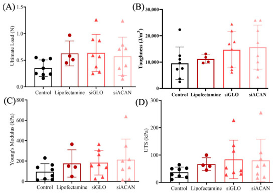 To investigate how the increase in fibril diameter affects the mechanics of the tissue-engineered meniscal entheses, we performed bulk and local tensile testing. Assessment of the bulk tensile properties of the constructs revealed no statistical difference between the groups (Figure 5). The ultimate load showed similar means for siGLO, Lipofectamine, and siACAN groups, and the ultimate load for siACAN was 63% higher (p = 0.45) than that for the control (Figure 5A). Toughness displayed a slight increasing trend going from the untransfected control to siACAN. The toughness of siACAN was increased by 64% (p = 0.3) compared to the control (Figure 5B). A similar trend was seen in Young’s modulus and UTS, with 125% (p = 0.37) and 117% (p = 0.46) increases, respectively, in siACAN compared to control constructs (Figure 5C,D). siGLO and siACAN constructs were comparable in all bulk mechanical properties. Notably, the spread of the data was large and there was a slight increasing trend in the average, with the untransfected control having the lowest values, followed by Lipofectamine, siGLO, and finally siACAN.