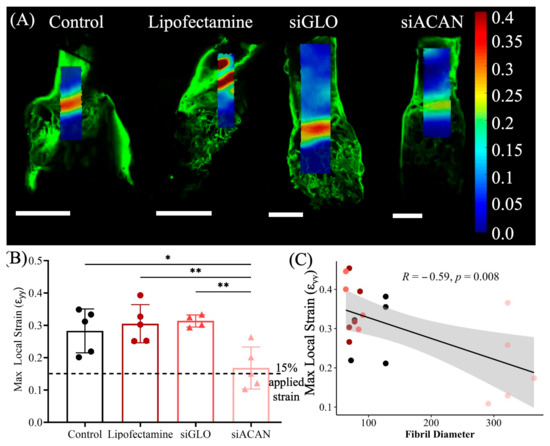 Noting the differences in mean values between control and siACAN groups, and the associated large spread of the data, we were interested in assessing how the change in fiber structure would affect the mechanical properties at a microscale level, since this length scale is where we observed the biggest changes in structure. Using confocal elastography, strain maps obtained at 15% applied strain show striking differences in the distribution and magnitude of strains experienced by the tissues (Figure 6A). Strain maps of the linear constructs for all groups showed concentrations of strain near the bone/collagen interface. These strain maps showed that in all control conditions, there was close to a 30% or greater strain near this interface. In the siACAN group, these interfaces experienced closer to 20% strain. To visualize this difference, we looked at the maximum local strains as quantified by the 95th percentile strains experienced by the tissue. siACAN-transfected constructs showed a decreased 95th percentile maximum local strain, which was correlated with increased fibril diameter, as shown by SEM, in this group (Figure 6B,C). Untransfected control, Lipofectamine control, and siGLO control all showed peaks of strain near the interface of the bone and soft tissue region in these constructs (Figure 6A).