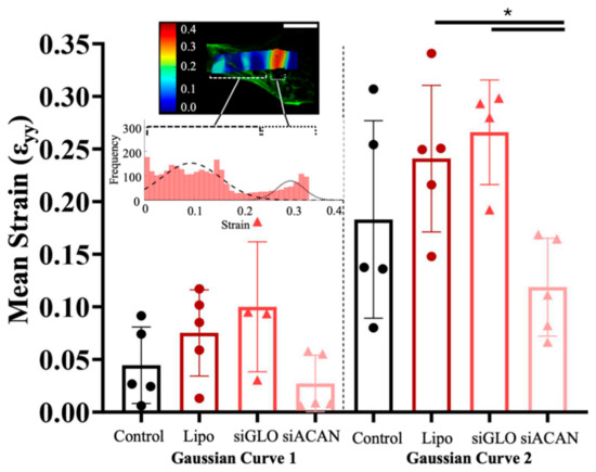 Means of Gaussian curves fitted to strain histograms from untransfected control, Lipofectamine control, siGLO Red control, and siACAN constructs at 15% applied strain. Inset shows a representative confocal elastography image overlayed with a strain map. Underneath, a histogram of strains fitted to two Gaussian curves shows that the first Gaussian curve describes the strains in the bulk tissue and the second describes the higher strain concentrations found at the interface of the bone plug and soft tissue region. Log transformations were taken of these data and analyzed using 1-way ANOVA with Tukey’s multiple comparisons test (n = 4–5) (* = p <0.05).