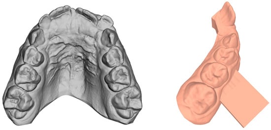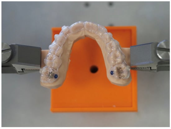 In the present study, experimental models reproducing the maxillary dental arch were used to test the mechanical behavior of the clear aligner and RPE. The models were additively manufactured using a stereolithography (SLA) 3D printer (Form 2, FormLabs, Somerville, MA, USA) with 50 μm resolution, with dental model resin (Formlabs, Somerville, MA, USA) as the printing material. SLA printers use a moving ultraviolet (UV) laser beam to selectively cure/solidify photopolymer patterns layer by layer. The models were printed from three-dimensional digital dental casts (Figure 1) obtained using a laser scanner with a reported manufacturing accuracy of 20 μm (iTero; Align Technologies, San Jose, CA, USA). Both resin dental models were manufactured with two parallels to the transversal plane rectangular solid fixture arms (12 mm length, 12 mm width, 3 mm height; Figure 1), designed with CAD software (3Shape Ortho System™, 3Shape, Copenhagen, Denmark), to be inserted in a testing machine (Bose ElectroForce® Planar Biaxial Test Bench, TA Instruments, New Castle, DE, USA) with a 225 N uniaxial load cell.