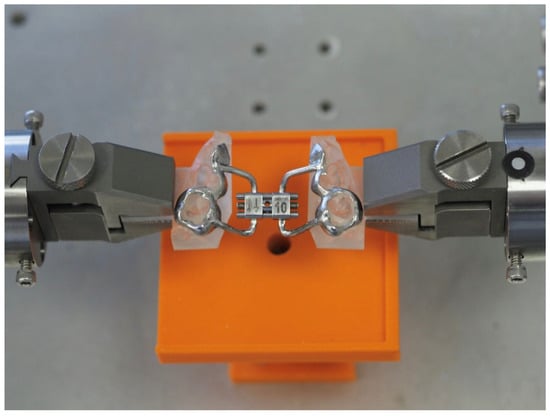 The resin model with the corresponding appliance was placed in the testing machine (Bose ElectroForce® Planar Biaxial Test Bench, TA Instruments, New Castle, DE, USA) by grabbing the rectangular solid fixture arms, trying to keep the expander as aligned as possible on the horizontal plane, as shown in Figure 3 and Figure 4. The specimens were clamped by titanium machine grips that were specifically developed for biomaterials and have knurled-flat faces to prevent slipping. The analysis of the video recordings demonstrates that there were neither anomalous behaviors nor failures near the clamps. Sliding through the testing grips was excluded, too, as no abrupt increase or decrease was detected in the experimental curves. No marks were observed on the specimen ends, and the extension of the grasped ends was found to be unchanged.