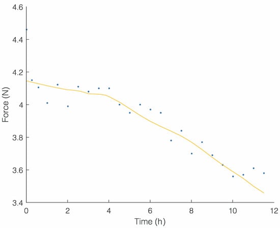 The mechanical load measurements along the mediolateral direction were plotted as a function of time for both appliances (clear aligner, Figure 5; RPE, Figure 6). The clear aligner exhibited an almost linear decay in overall force trend after approximately three hours, starting at an initial force of around 4.2 N and gradually decreasing to approximately 3.4 N after 12 h (Figure 5).