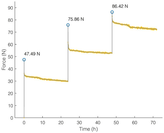 The RPE exhibited a rise in force values and a sharp decrease in the correspondence of each activation, and a slow decay was recorded during the 24 h between consecutive activations. The forces generated after three activations were significantly higher than those generated after one activation; the force increases immediately after the three activations were 47.49 N, 46.06 N, and 33.59 N, respectively, while the force peak values are depicted in Figure 6.