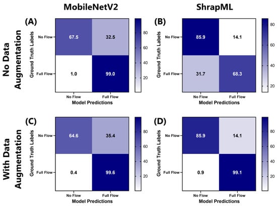 Confusion matrices for MobileNetV2 and ShrapML models tracking junctional vessel occlusion. Average confusion matrices (n = 3 trained models) are shown for (A,C) MobileNetV2 and (B,D) ShrapML models, (A,B) without data augmentation and (C,D) with data augmentation. Confusion matrix values are expressed as percentages across each ground truth category.