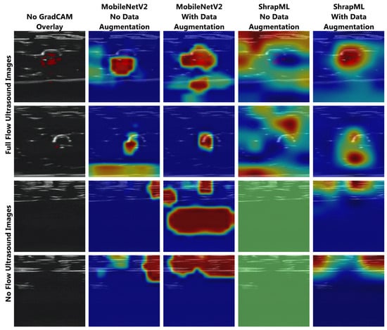 Gradient-weighted class activation maps (GradCAM) for trained binary classifier models for ultrasound tracking of junctional vessel occlusion. (Column 1) Base ultrasound images are shown for reference as well as (left to right) GradCAMs for Mobile Net V2 without and with data augmentation, and ShrapML without and with data augmentation. Representative ultrasound images are shown for full-flow and no-flow categories. Areas with high relevance to model predictions are highlighted by red-yellow overlays, while lower relevance regions are highlighted in blue-green.