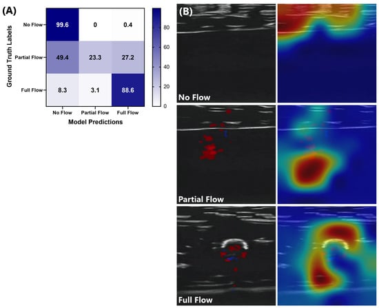Three-category ShrapML performance for tracking junctional vessel occlusion. (A) confusion matrix for three categories—no flow, partial flow, and full flow—ShrapML models with affine transformations for data augmentation. (B) GradCAM overlays for representative ultrasound images for each of three categories. Areas with high relevance to model predictions are highlighted by red-yellow overlays, while lower relevance regions are highlighted in blue-green.