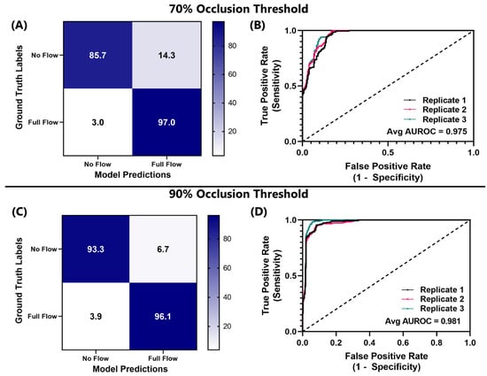 Confusion matrix and receiver operating characteristic (ROC) curve for ShrapML models tracking junctional vessel occlusion in swine image sets. Results are shown for three replicate trained models, shown as average values for the (A,C) confusion matrix and (B,D) individual ROC curves for a (A,B) 70% or (C,D) 90% occlusion threshold.
