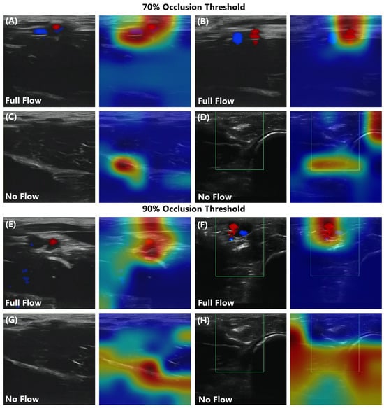 GradCAM overlays for ShrapML models trained with swine image sets. Representative images are shown for (A–D) a 70% or (E–H) a 90% occlusion threshold. Full-flow and no-flow ultrasound representative image categories are shown without and with GradCAM overlays. Areas with high relevance to model predictions are highlighted by red-yellow overlays, while lower relevance regions are highlighted in blue-green. Color Doppler overlay region is shown as a green box for images captured with Sonosite Edge.