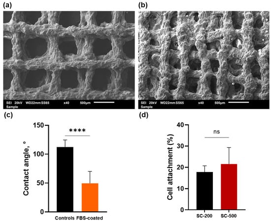 In this study, scaffolds with two different pore sizes were tested: 500 (SC500) and 200 (SC200) µm (Figure 1a,b, respectively). Specifically, the average channel width was 512.3 ± 99.4 μm for SC-500 and 241.4 ± 61.5 μm for SC-200. Additionally, despite maintaining the 3D grid-like lattice architecture, the 3D printing directly from sol–gel produced struts with irregular surface. To enhance cell adhesion to the scaffolds, the materials were pre-treated with FBS. Thereafter, the hydrophilicity of the surface, before and after coating with FBS, was evaluated via contact angle measurements on SC-200. The hydrophilicity of the scaffolds was enhanced significantly after surface treatment with FBS (from an average Theta degree of 112.41 to 49.51) (p < 0.0001) (Figure 1c).