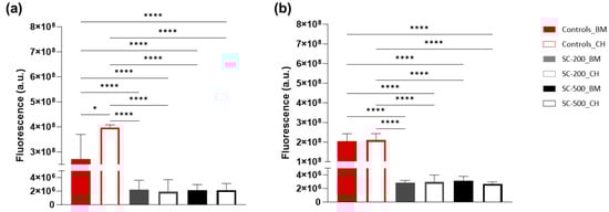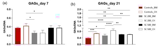 Normalised sulfated GAG content was measured on days 7 (Figure 9a) and 21 (Figure 9b). On day 7, a similar amount of GAGs was produced by oBMSC treated with different conditions. The only statistical differences were recorded for 2D controls in CH, whose GAG production was higher than SC-200 in BM and SC-200 in CH (p < 0.05). On day 21, instead, the overall amount of sulfated GAGs produced on SC-200 was significantly higher than the other groups (p < 0.05). For most of the samples, GAG content ratios increased with time: for 2D controls in CH (p < 0.001), for SC-200 in BM (p < 0.001), for SC-200 in CH (p < 0.0001), for SC-500 in BM (p < 0.001), and for SC-500 in CH (p < 0.001) (Figure S3). The results confirmed that the production of ECM markers, such as GAGs, increased on scaffolds, even without the use of exogenous growth factors.