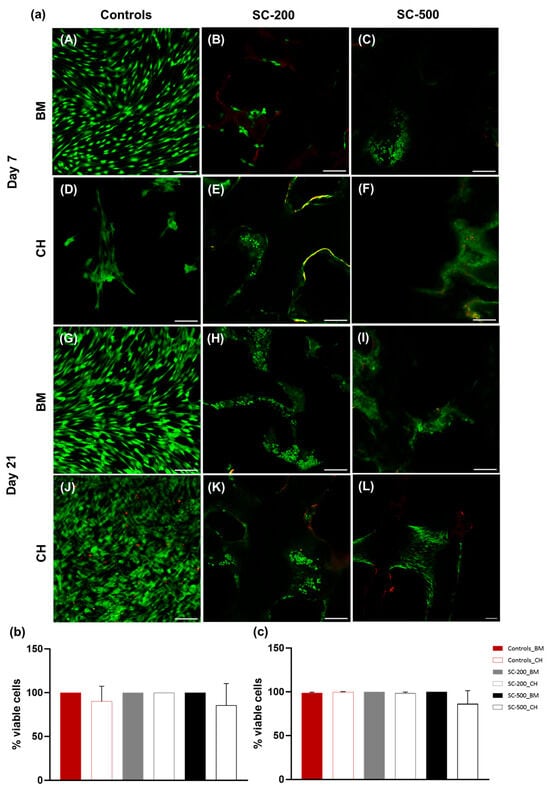 (a) Representative images of live/dead staining of oBMSC, grown in either basal (BM) or chondrogenic medium (CH), on days 7 and 21. Cells were imaged on either coverslip (A,D,G,J), SC-200 (B,E,H,K) or SC-500 (C,F,I,L) by a confocal microscope. Scale bar is 80 µm. Quantitative analysis of live and dead cells on coverslips and controls on days 7 (b) and 21 (c). Results are presented as a mean ± SD (n = 3). Error bars denote standard deviation. One-way ANOVA was used to compare the different groups at each time point (7 and 21 days): p > 0.05.