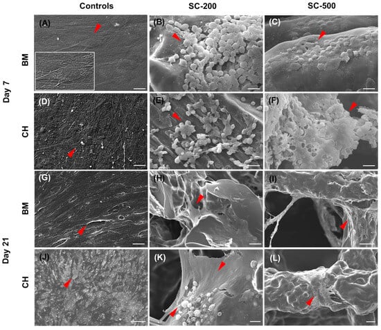 SEM images representing oBMSC cultured on coverslips (A,D,G,J) and scaffolds (B,C,E,F,H,I,K,L), at days 7 and 21. Ovine bone marrow stem cells were grown with either basal medium (BM) or chondrogenic medium (CH). Red arrows indicate cells on coverslips and scaffolds. (A) includes a zoomed-in photo (white picture border) of the stem cell indicated by the red arrow. All the images have a scale bar of 20 µm, except for SC-200/BM/Day 21 (40 µm), SC-500/BM/Day 21 (100 µm), and SC-500/CH/Day 21 (50 µm).
