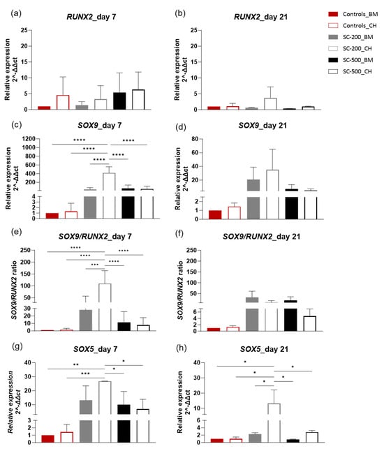 COL2A1/COL1A1 ratios (Figure 6e,f) were always positive for cells on scaffolds, treatments, and time points, with the highest ratios recorded for SC-200 in chondrogenic medium on day 7 (14-fold). The ratio was significantly different for SC-200 in chondrogenic medium compared to 2D controls in BM (p < 0.01) and CH (p < 0.05), SC-200 in BM (p < 0.01), and SC-500 in BM (p < 0.05). No statistical difference was recorded for the different groups at different time points, except for SC-200 CH (p < 0.0001) (Figure S2g). The COL2A1/COL1A1 positive ratios confirmed that the chondrogenic shifting remained predominant, in comparison to the osteogenic route, on day 21 for all the treatments.
