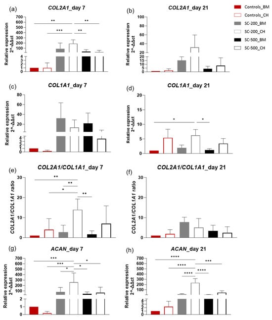The pore size appeared to influence the expression of ACAN on day 7 (Figure 6g); in chondrogenic medium, 200 µm pore size promoted a significantly higher expression of aggrecan (260-fold) in comparison to the 2D controls in BM (p < 0.001) and CH (downregulated) (p < 0.0001) and SC-500 in BM (p < 0.01) and in CH (p < 0.01). Interestingly, on day 7, ACAN expression was upregulated on both SC-200 (85-fold) and SC-500 (47-fold), even without the addition of chondrogenic growth factors (p > 0.05). ACAN expression decreased between days 7 and 21 for cells on all the scaffold, but the difference was not significant (p > 0.05) (Figure S2f). Finally, no statistical difference was calculated between the different groups on day 21 (p > 0.05) (Figure 6h).