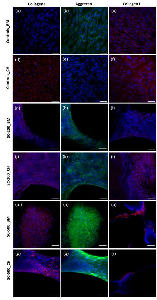 Representative immunohistochemical images of oBMSC on coverslips (a–f) and on SC-200 (g–l) and SC-500 (m–r) cultured for 21 days with chondrogenic (“_CH”) and basal (“_BM”) medium. COL2 is marked in red, ACAN in green, COL1 in red, and nuclei in blue. The scale bar is 66 µm.