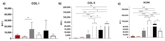 Quantitative analysis of mean fluorescence intensity (MFI) of (a) collagen type I, (b) collagen type II, and (c) aggrecan in 2D and on scaffolds (SC-200 and SC-500) on day 21. Data are reported as mean ± SD, n = 3. Comparison between groups was assessed by ordinary one-way ANOVA (p < 0.05) (* p < 0.05, ** p < 0.01, *** p < 0.001, **** p < 0.0001).
