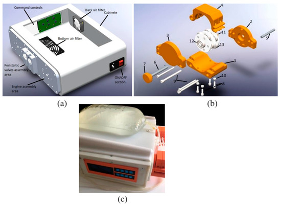 (a) APDM design, (b) Peristaltic pump exploded view, (c) APD machine with dialysate fluid bag. Reprinted from Ref. [23].
