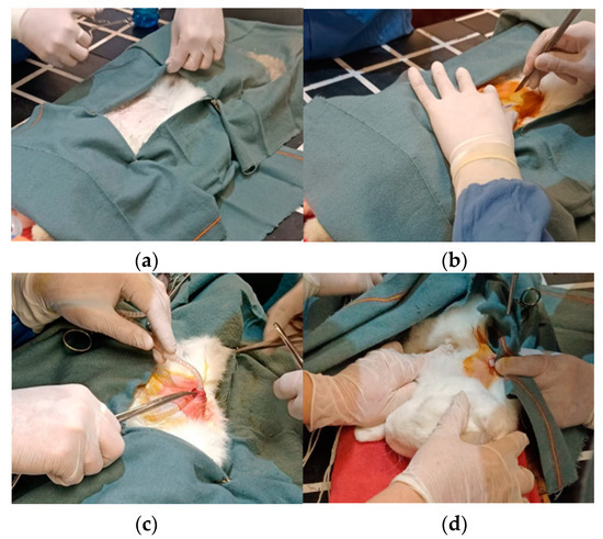 Catheter placement surgery. (a) The area preparation; (b) the first contact with the peritoneal area; (c) the catheter placement; and (d) the relocation of the manipulated catheter to a better area where the patient could not hurt himself.