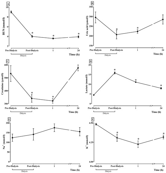 The BUN concentration (A), uric acid (B), creatinine (C), lactate (D), sodium (Na+) (E), and potassium (K+) (F) of rabbits with CKD after PD. Data represent mean ± SEM. (*) p < 0.05 compared to the Basal. RM one-way ANOVA and SNK post hoc test.
