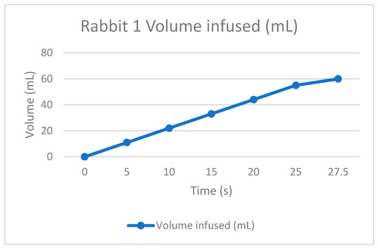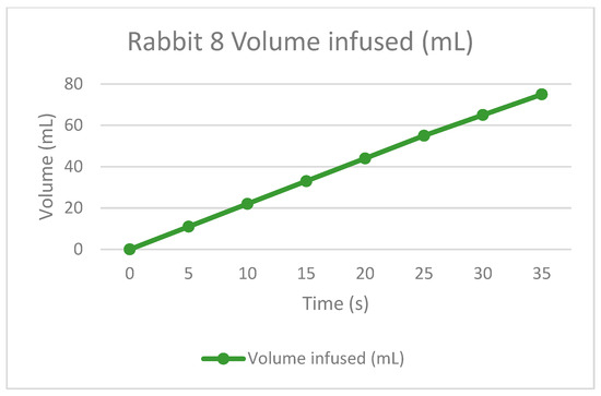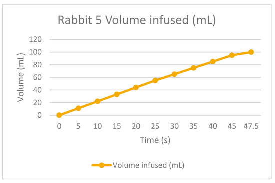 The following graphs of Figure 9, Figure 10, Figure 11 and Figure 12 show the volume-infused behavior, representing the constant flow that the peristaltic pumps allowed for transporting during each therapy, according to the time-based results.