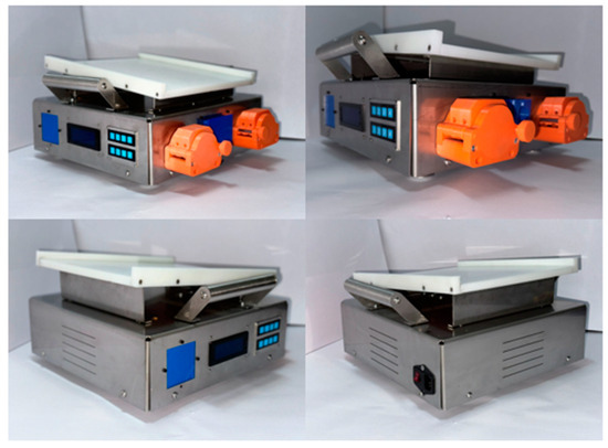 An automated peritoneal dialysis (APD) machine is a device used to practice therapy in an automated way. This is recommended to increase CKD patients’ life expectancy and not invade their everyday activities. The APD machine (APDM) showed in Figure 3, was developed to improve the standard method using disposable cassettes that allow the fluid of the dialysate fluid bags to be transported. This is substituted by peristaltic pumps which transport the fluid through the roller mechanism outside the hoses and continue pressing them to control the quantity and velocity of the liquid. This is a general innovation of the machine. The functioning of the APDM is typical, involving three processes: the mechanic subsystem, the electronic subsystem, and the control subsystem. The mechanic subsystem contains the heating process, hose calculation, and the partial design of pumps. The electronic subsystem comprises the selection and design of elements that make the system work. Finally, for the control, the subsystem stores the algorithm that controls all of the components [23].