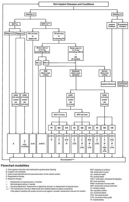 It is now clear that peri-implant disease is more complex and challenging to treat than diseases involving natural teeth. Therefore, management of the health of the tissues surrounding functioning dental implants is essential. We propose a new management flowchart for peri-implant health and disease (Figure 1). The treatment plan for peri-implant disease is decided based on the mobility, BOP, presence of dental plaque, width of the KM and VD, PD, presence of bone loss, amount of bone defect configuration, and thickness of the KM. The BOP is considered the initial examination parameter to assess the peri-implant health condition, except for mobility, in the process of clinical screening. Microbiological tests as additional evaluation items may be helpful in assessing the risk of peri-implant diseases when BOP is observed in the soft tissue around the dental implant [79]. In addition, several clinical parameters, such as PD, plaque deposition, and radiographic examination, should be evaluated. Complete understanding of the peri-implant conditions is critical for planning treatments and supportive procedures. BS is sometimes useful when the morphology of the bone defect is not clearly understood on radiography or CBCT [91]. In addition, it is important to evaluate the KM and VD widths, KM thickness, and bone defect configuration to determine the appropriate treatment strategies for advanced peri-implant disease.